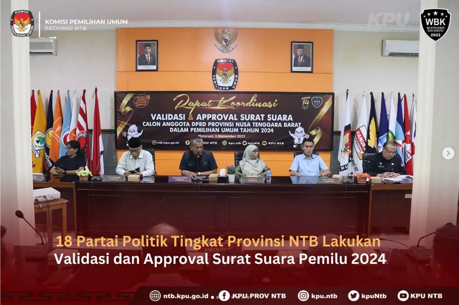 KPU Provinsi NTB telah melaksanakan Rapat Koordinasi Validasi dan Approval Dummy Surat Suara Calon Anggota DPRD Provinsi NTB, Rabu (1/11). Dalam sambutannya Ketua KPU Provinsi NTB, Suhardi Soud memaparkan bahwa Rapat Koordinasi ini sangat penting karena terkait Surat Suara yang akan digunakan dalam Pemilu Tahun 2024.