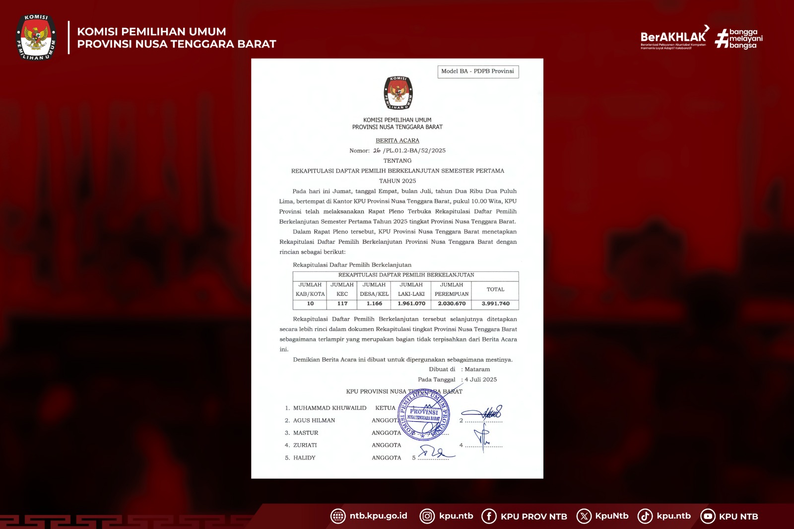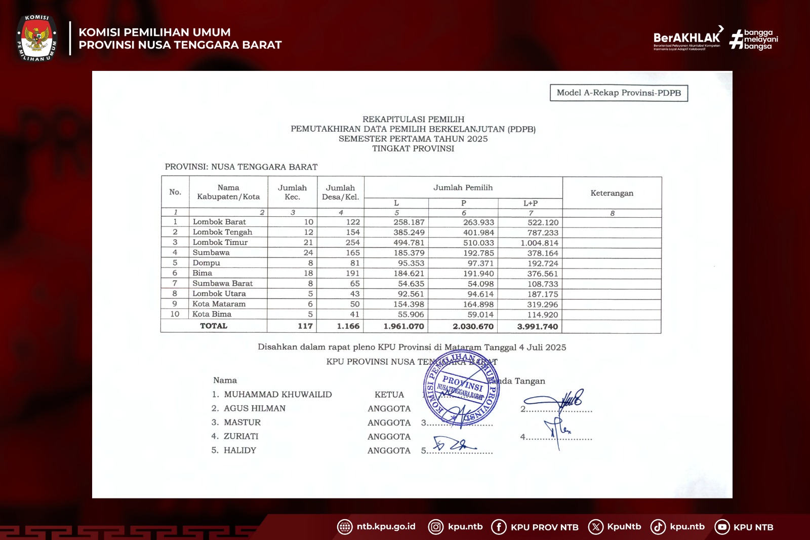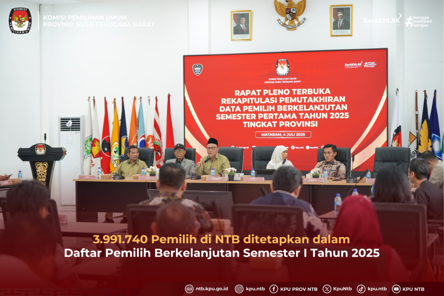 KPU Provinsi NTB adakan Rapat Pleno Terbuka Rekapitulasi Daftar Pemilih Berkelanjutan Semester I Tahun 2025, Jum’at (4/7) yang dilaksanakan secara serentak seluruh Indonesia. Hasil rapat pleno menetapkan sebanyak 3.991.740 pemilih dengan rincian pemilih laki-laki 1.961.070, pemilih perempuan 2.030.670, yang tersebar di 10 Kabupaten/Kota di 117 Kecamatan dan di 1.166 Desa/Kelurahan
