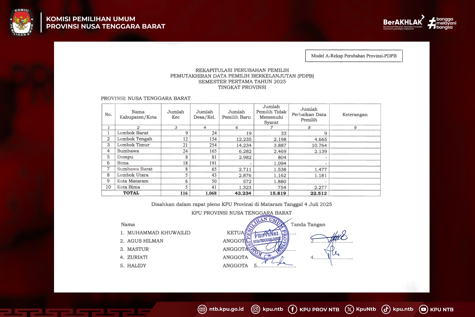 Dalam periode semester pertama ini terdapat 43.234 pemilih baru yang ditambahkan ke dalam daftar pemilih, sementara 15.819 pemilih yang tidak memenuhi syarat dikeluarkan dari daftar, dan perbaikan data pemilih dilakukan sebanyak 22.512 pemilih. Mutasi dan perbaikan Data Pemilih terjadi di 1.068 Desa/Keluarahan di seluruh Wilayah NTB.