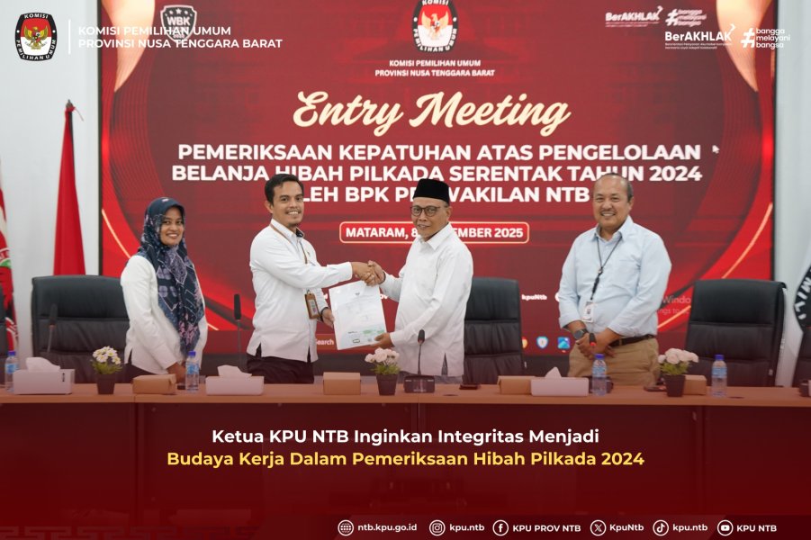 Badan Pemeriksa Keuangan (BPK) Perwakilan NTB menggelar Entry Meeting Pemeriksaan Kepatuhan Atas Pengelolaan Belanja Hibah Pilkada Serentak Tahun 2024 pada Senin (8/9), dihadiri jajaran KPU Provinsi NTB serta Tim Pemeriksa dari BPK. Kegiatan ini menjadi langkah awal dalam proses pemeriksaan yang akan berlangsung selama 40 hari ke depan.