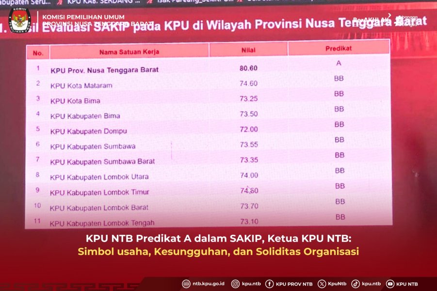 Komisi Pemilihan Umum (KPU) Provinsi Nusa Tenggara Barat (NTB) berhasil meraih predikat A dalam penilaian Sistem Akuntabilitas Kinerja Instansi Pemerintah (SAKIP) KPU se Indonesia. Raihan ini disampaikan, Senin (15/9) melalui daring oleh KPU Republik Indonesia dengan capaian Nilai yang di raih KPU NTB sebesar 80,60 kedua KPU DIY dengan nilai 80,20 dan ketiga KPU Banten dengan nilai 80,15.