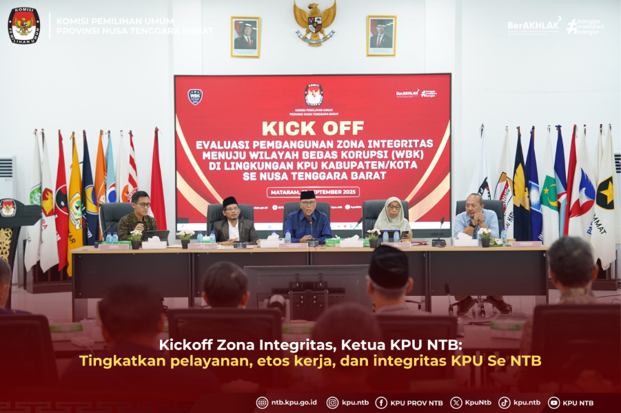 KPU Provinsi NTB melaksanakan Kickoff evaluasi Zona Integritas (ZI) KPU Kabupaten/Kota se Provinsi NTB, Selasa (23/9). Acara yang berlangsung secara hybrid ini diikuti Anggota Divisi Hukum dan Sekretaris KPU Kabupaten/Kota se-NTB.