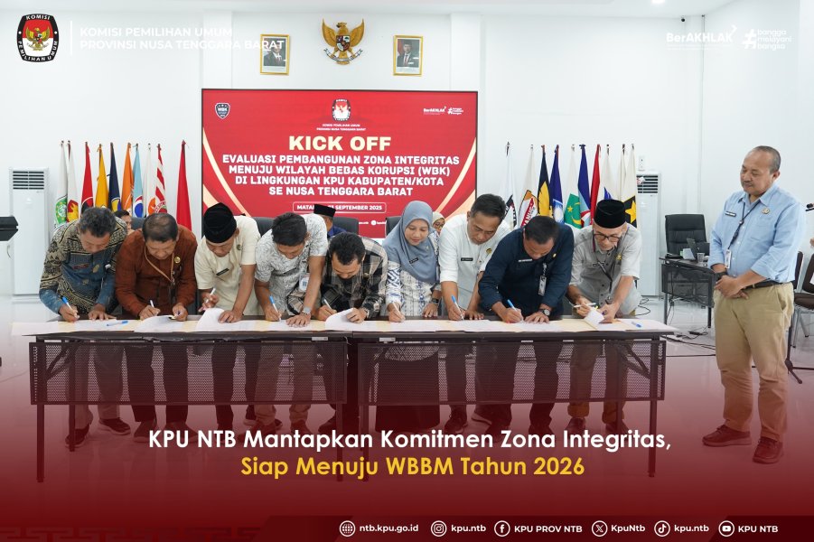 KPU Provinsi NTB kembali menegaskan komitmennya dalam memperkuat tata kelola kelembagaan yang bersih, transparan, dan akuntabel melalui kegiatan Kick Off Evaluasi Pembangunan Zona Integritas (ZI) Menuju Wilayah Bebas dari Korupsi (WBK) yang diikuti KPU Kabupaten/Kota se-NTB, Selasa (23/9). Kegiatan ini menjadi bukti keseriusan KPU NTB dalam membangun budaya kerja berintegritas sekaligus mempersiapkan diri menuju Wilayah Birokrasi Bersih dan Melayani (WBBM) di tahun 2026 mendatang.