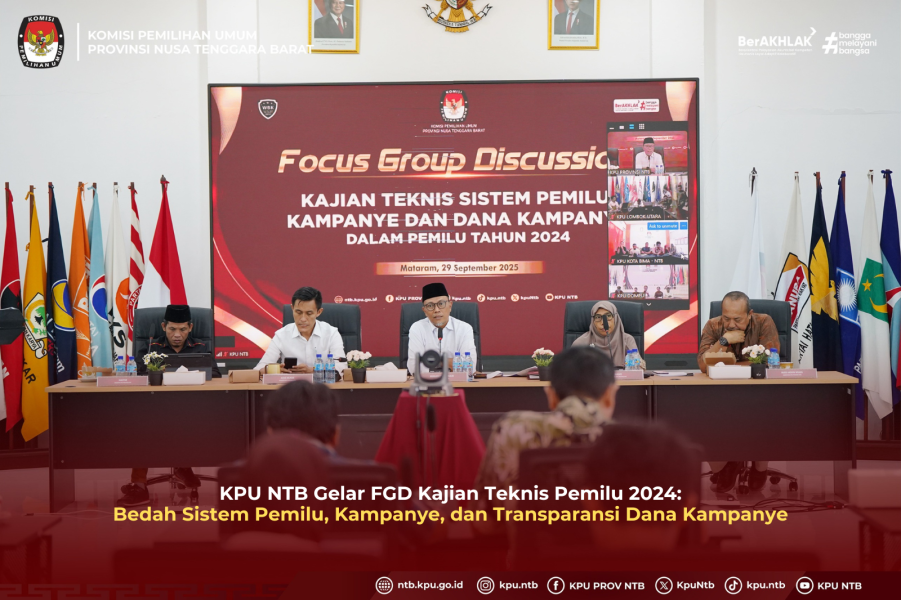 Focus Group Discussion (FGD) Kajian Teknis yang digelar oleh Komisi Pemilihan Umum (KPU) Provinsi Nusa Tenggara Barat (NTB) pada Senin (29/9) menghasilkan sejumlah rekomendasi strategis untuk penyempurnaan penyelenggaraan Pemilu ke depan. Rekomendasi tersebut mencakup perlunya penyederhanaan sistem pemilu agar lebih mudah dipahami publik, penguatan regulasi dan pengawasan dana kampanye melalui keterlibatan lembaga keuangan, serta peningkatan akuntabilitas partai politik dalam pelaporan.