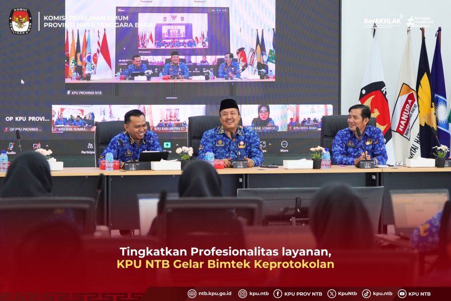 KPU Provinsi NTB gelar Bimbingan Teknis (Bimtek) Peningkatan Kapasitas Keprotokolan bagi jajaran KPU Provinsi serta KPU Kabupaten/Kota se-NTB, Rabu (28/10). Kegiatan ini bertujuan memperkuat kemampuan petugas dalam menyiapkan dan mengelola keprotokolan pada setiap kegiatan resmi lembaga, agar semakin tertib, profesional, dan berkelas. Melalui kegiatan ini, KPU NTB berharap seluruh peserta mampu menerapkan standar keprotokolan yang seragam dan profesional di setiap kegiatan kelembagaan, baik di tingkat provinsi maupun kabupaten/kota.