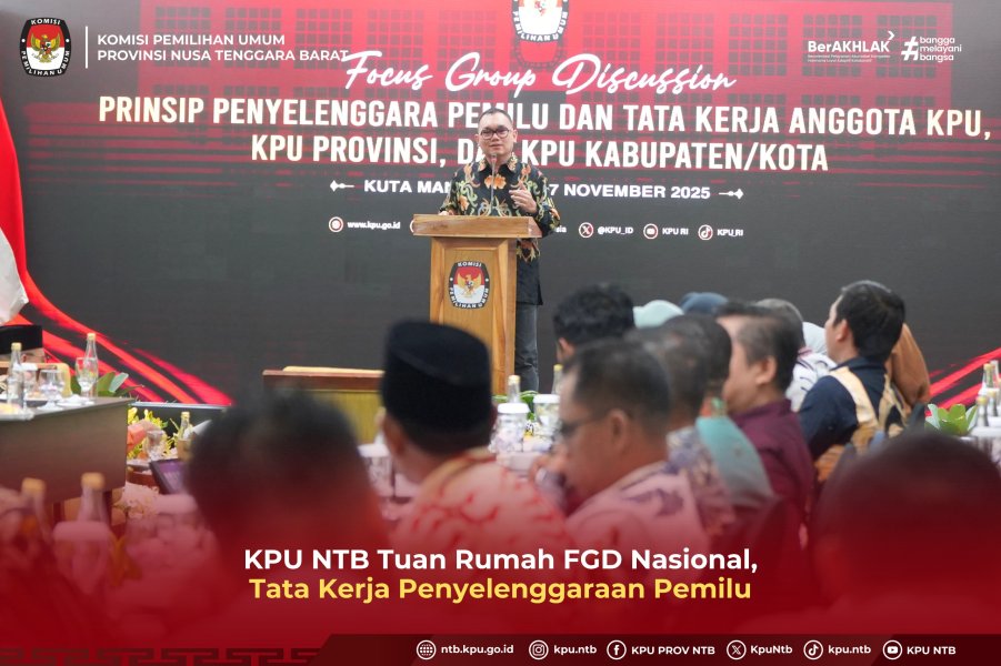 KPU Provinsi NTB menjadi tuan rumah Focus Group Discussion (FGD) bertema Prinsip Penyelenggaraan Pemilihan dan Tata Kerja Anggota KPU, KPU Provinsi, serta KPU Kabupaten/Kota. Kegiatan berlangsung di Mandalika selama dua hari, 6–7 November 2025 yang bertujuan untuk memperkuat tata kelola kelembagaan dan sinergi antardivisi di lingkungan KPU seluruh Indonesia.