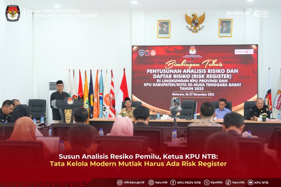 KPU Provinsi NTB menegaskan pentingnya penerapan manajemen risiko sebagai bagian dari tata kelola modern di lingkungan kelembagaan Pemilu. Hal ini disampaian Ketua KPU Provinsi NTB, M. Khuwailid dalam acara Bimbingan Teknis Penyusunan Analisi Resiko dan Daftar Resiko atau Risk Register, di Lingkungan KPU se NTB, Rabu (26/11) secara Daring dan Luring.