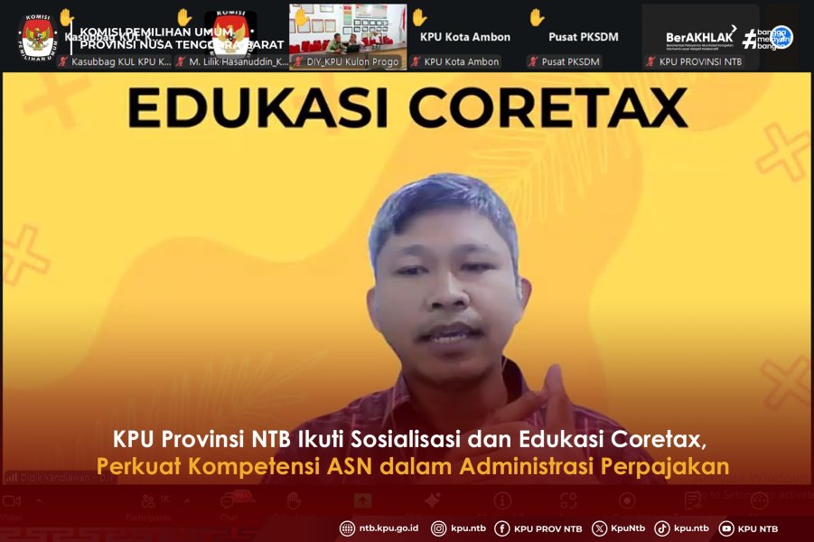 KPU Provinsi NTB mengikuti kegiatan Sosialisasi dan Edukasi Coretax oleh Direktorat Jenderal Pajak, sebuah agenda khusus bagi ASN KPU seluruh Indonesia untuk memperkuat pemahaman dan keterampilan dalam menggunakan sistem inti administrasi perpajakan terbaru, Kamis (11/12) melalui Zoom.