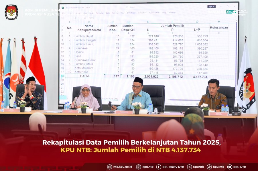 Berdasarkan hasil rekapitulasi PDPB Semester II Tahun 2025, jumlah pemilih di Provinsi NTB tercatat sebanyak 4.137.734 pemilih yang teridir dari Pemilih Laki-laki berjumlah 2.031.022 dan pemilih Perempuan berjumlah 2.106.712, yang tersebar di 10 kabupaten/kota, 117 kecamatan, dan 1.166 desa/kelurahan. Adapun rincian hasil pemutakhiran meliputi 213.282 pemilih baru, 67.288 pemilih tidak memenuhi syarat (TMS), serta 115.721 perubahan data pemilih.
