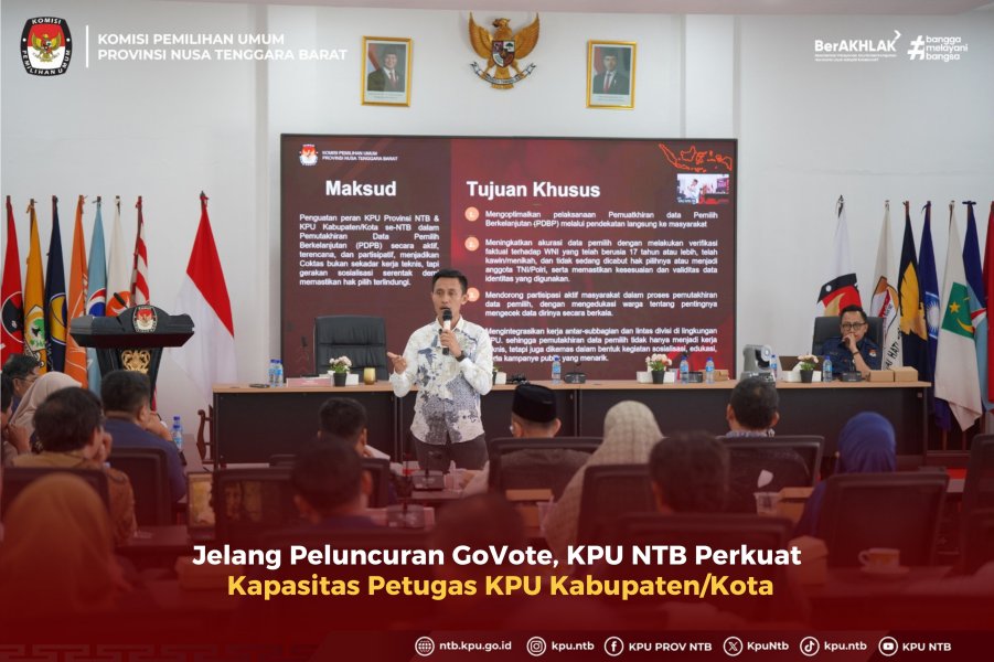 Jelang peluncuran Program GoVote, KPU Provinsi NTB lakukan pembekalan kepada petugas GoVote KPU Kabupaten/Kota Sabtu (13/12) di Kantor KPU Provinsi NTB. Pembekalan ini menjadi langkah strategis untuk menyamakan pemahaman, memperkuat kapasitas, serta menegaskan GoVote sebagai inovasi layanan dan gerakan bersama KPU se-NTB.