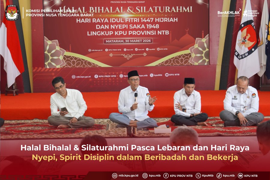 Pasca libur cuti bersama, Komisioner dan jajaran Sekretariat KPU Provinsi NTB menggelar Halal Bihalal dan Silaturrahmi Hari Raya Idul Fitri 1447 H dan Nyepi Tahun Saka 1948, Senin (30/3). Acara ini sebagai momentum untuk memperkuat semangat disiplin dalam beribadah dan bekerja.