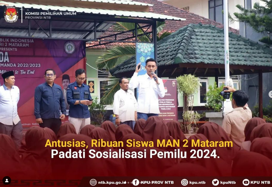 #TemanPemilih, KPU Provinsi NTB laksanakan sosialisasi tahapan Pemilu 2024 segmen Pemilih Pemula di MAN 2 Mataram. Sejumlah 1400 siswa beserta guru antusias hadiri sosialisasi Tahapan Pemilu 2024, Sabtu (14/8)