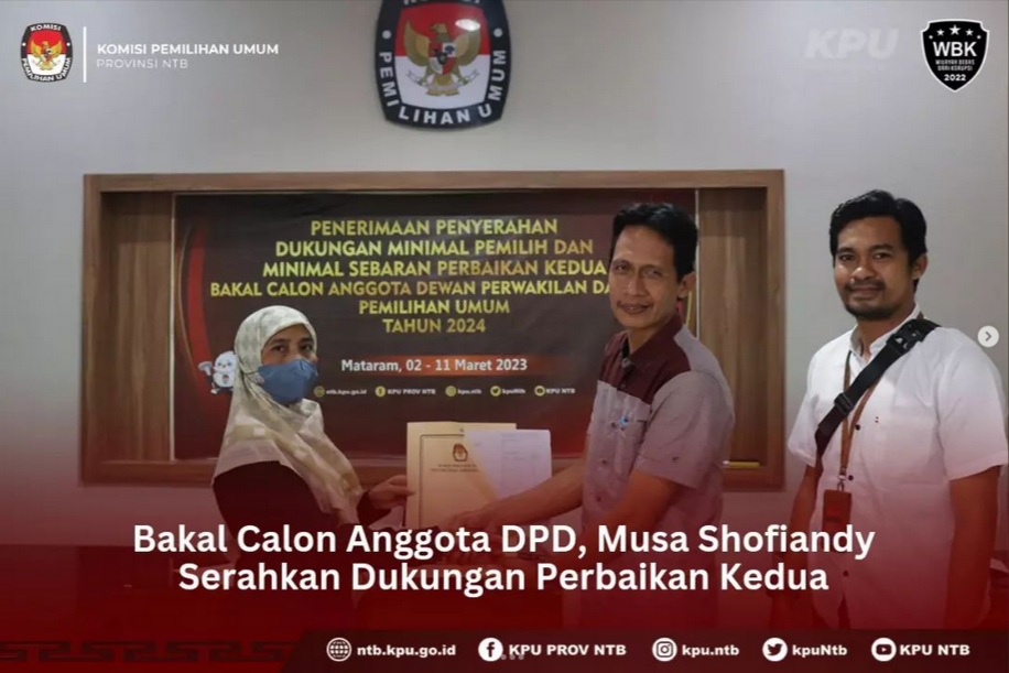 Sebelumnya, Bakal Calon Anggota DPD atas nama Musa Shofiandy dinyatakan Belum Menenuhi Syarat Dukungan Minimal Pemilih hasil Verifikasi Faktual Kesatu dengan jumlah dukungan MS sebanyak 1884 yang tersebar di 8 Kabupaten/Kota. Pada tahap penyerahan perbaikan kedua ini, dukungan yang diserahkan sebanyak 535 dukungan yang tersebar di 4 Kabupaten/Kota, yaitu Kabupaten Lombok Tengah, Kabupaten Lombok Utara, Kabupaten Lombok Timur, dan Kota Mataram.