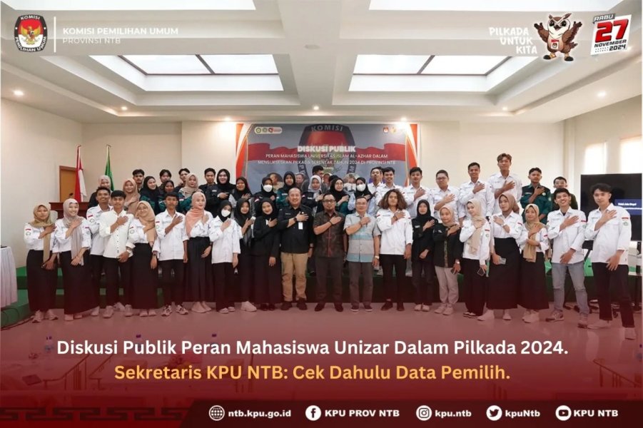 Hadir dalam Diskusi Publik dengan tajuk Peran Mahasiswa Universitas Islam Al-Azhar (Unizar) dalam Pilkada Serentak 2024, Sekretaris KPU Provinsi NTB Mars Ansori Wijaya meminta dahulu kepada seluruh mahasiswa mengecek data diri masing-masing apakah para mahasiswa Unizar terdaftar sebagai pemilih pada Pilkada 2024.