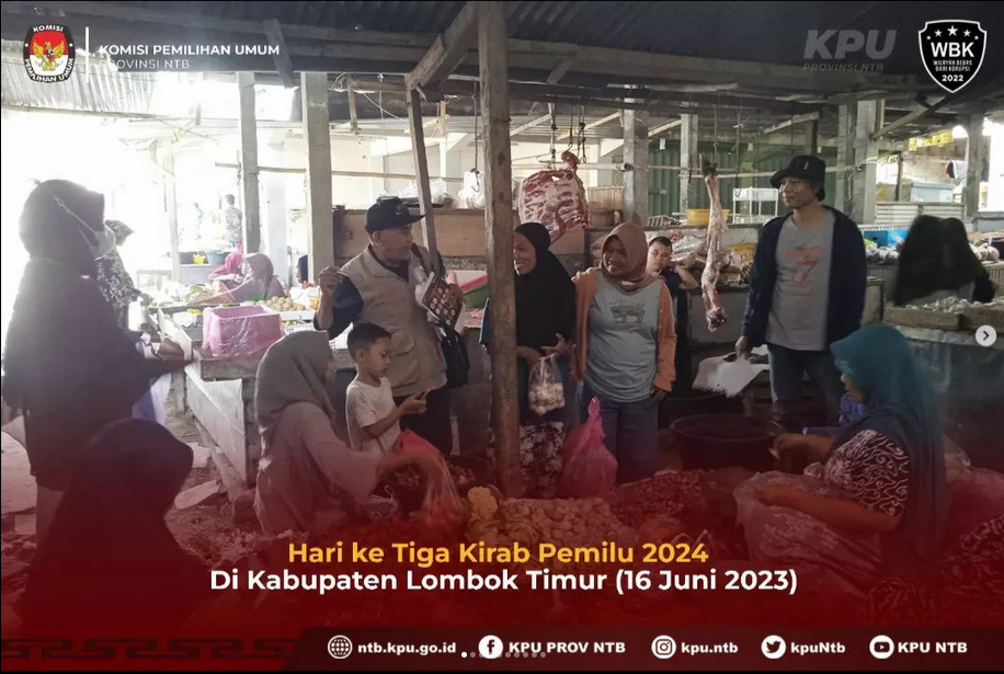 Pada Hari Ketiga Kirab Pemilu 2024 (16/6) di Kabupaten Lombok Timur oleh KPU Kabupaten Lombok Timur menyambangi masyarakat yang berada di Kecamatan Sikur, Terara dan Montong Gading. Berikut titik-titik yang dijangkau oleh Tim Kirab Pemilu 2024: