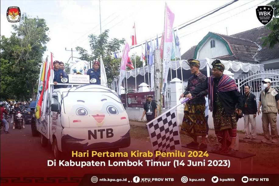 Kirab Pemilu 2024 hari pertama (14/6) di Kabupaten Lombok Timur oleh KPU Lombok Timur diawali dengan serah terima Bendera Kirab Pemilu 2024 dari KPU Sumbawa kepada KPU Lombok Timur.