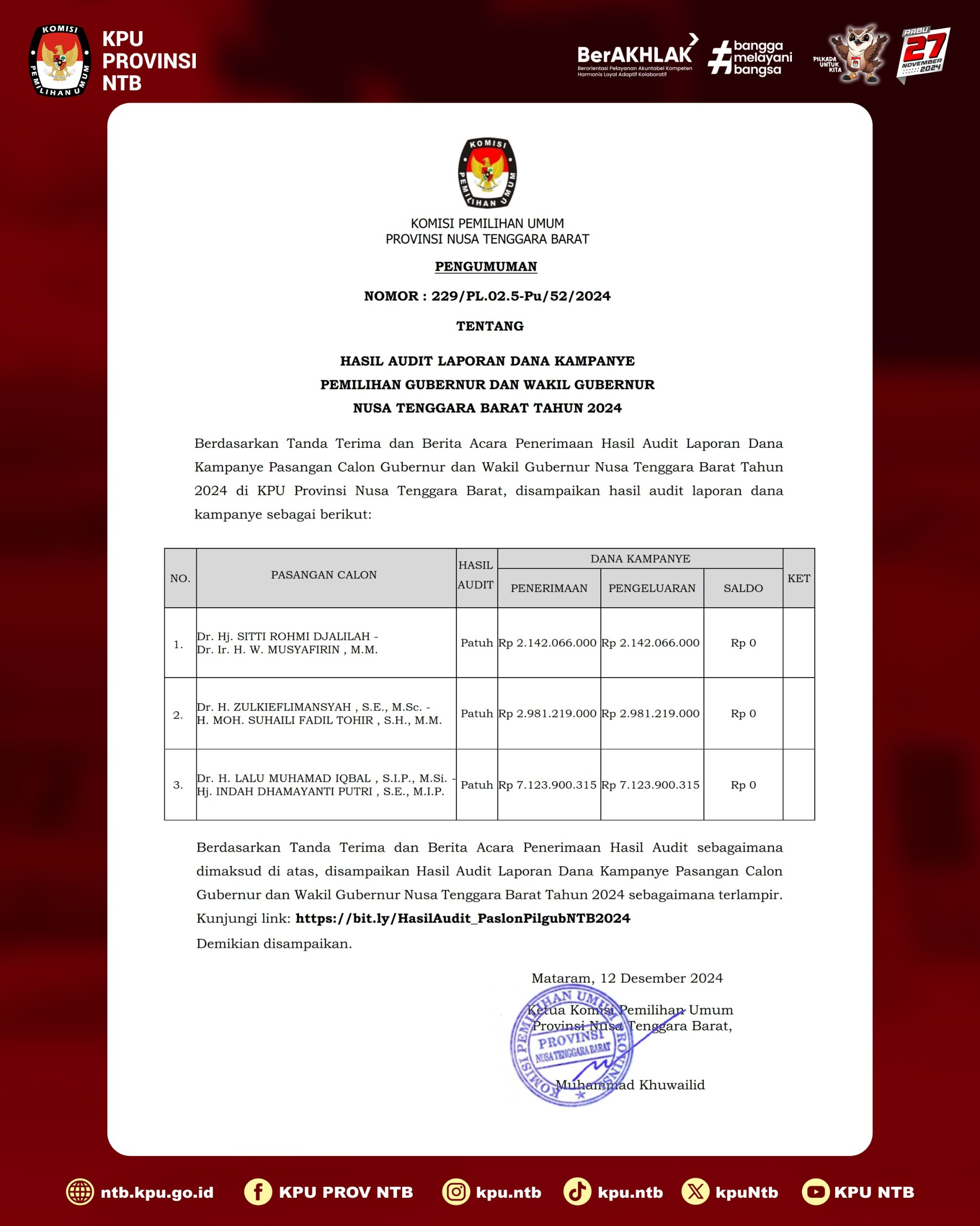 Hasil Audit Laporan Dana Kampanye Pilgub NTB Tahun 2024 Kamis, 12 Desember 2024 19:30 1529 [Download Pengumuman] Bagikan: Dilihat 1,529 Kali.