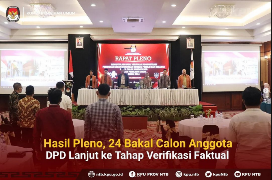 Sebanyak 24 Bakal Calon Anggota DPD Dapil Provinsi NTB dinyatakan Memenuhi Syarat verifikasi administrasi, yang selanjutkan akan memasuki Tahapan Verifikasi Faktual di tingkat kabupaten/kota di wilayah Provinsi NTB