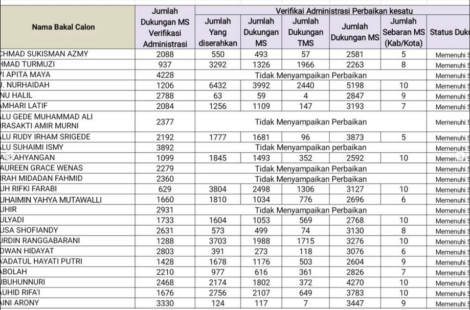 Sementara itu meski dinyatakan Memenuhi Syarat (MS) pada penyerahan awal, 9 bakal calon anggota DPD lainnya juga menyampaikan