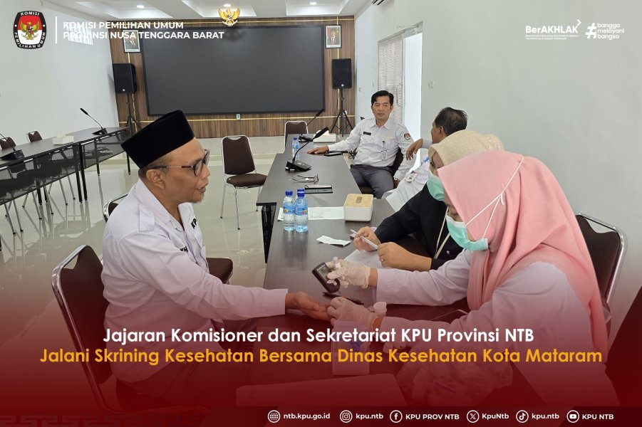 Dalam upaya menjaga kesehatan dan mencegah risiko penyakit tidak menular (PTM), KPU Provinsi NTB bekerjasama dengan Dinas Kesehatan Kota Mataram melalui Puskesmas Dasan Agung menggelar kegiatan skrining kesehatan menyeluruh bagi seluruh jajaran komisioner dan Sekretariat KPU Provinsi NTB.