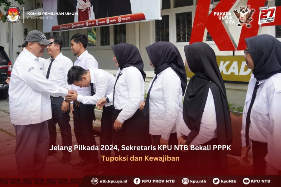 Menjelang pelaksanaan Pemilihan Kepala Daerah (Pilkada) serentak 2024, Sekretaris KPU Provinsi NTB Asep Suhlan memberikan pembekalan kepada Pegawai Pemerintah dengan Perjanjian Kerja (PPPK) tenaga teknis tahun 2023 Tugas Pokok, fungsi dan kewajiban sebelum mereka tugas di Satuan Kerja masing-masing, Senin (3/6) di Kantor KPU Provinsi NTB.