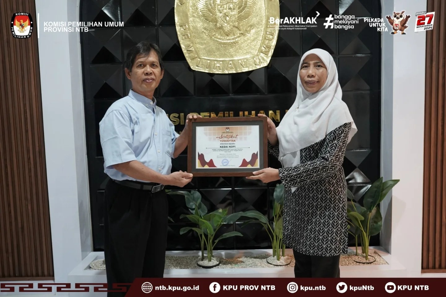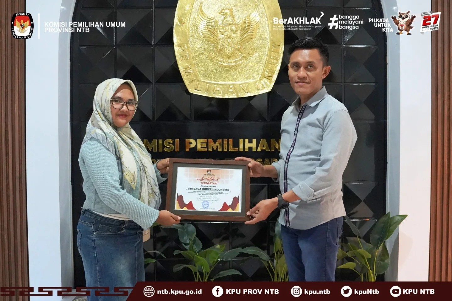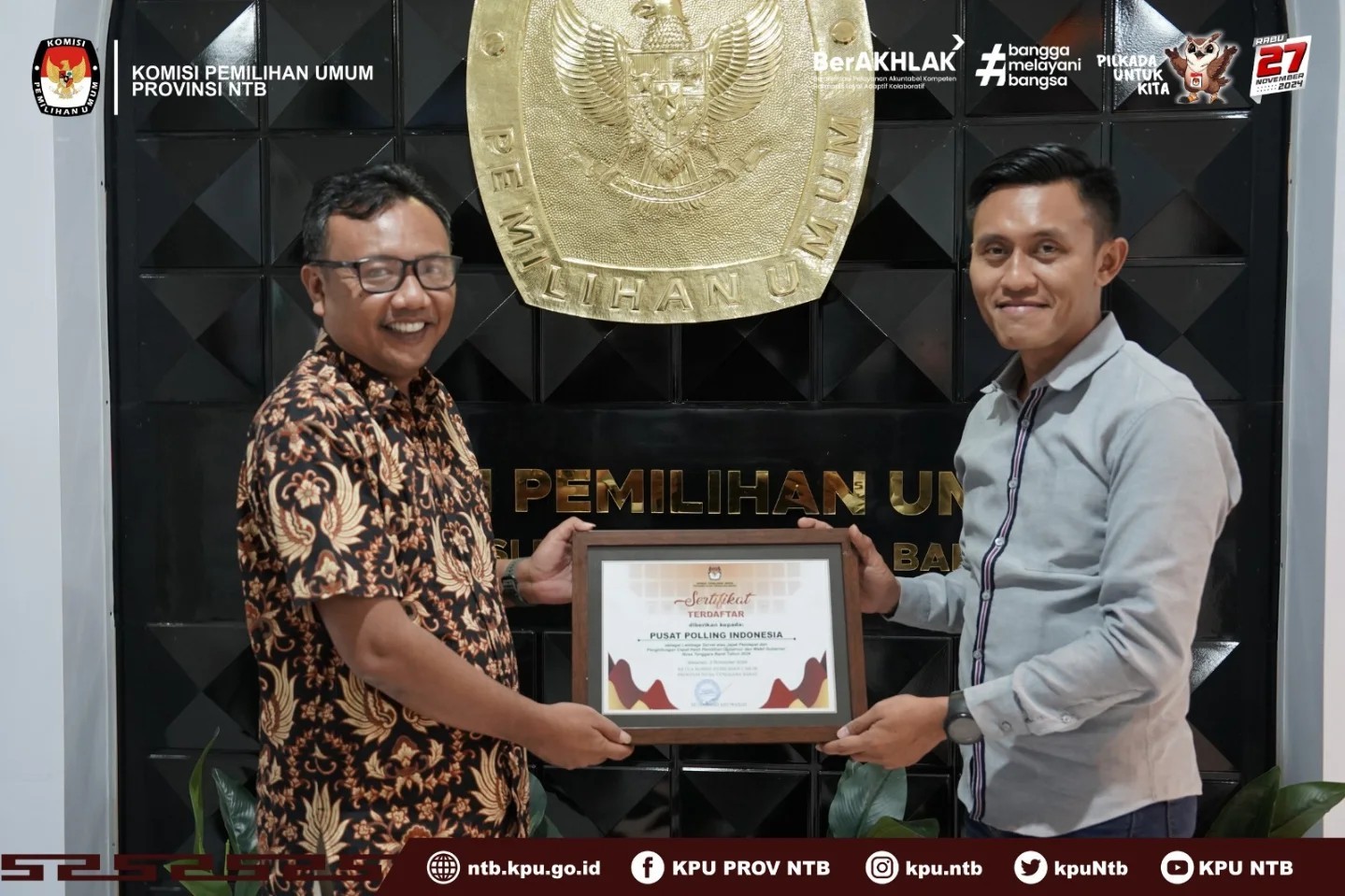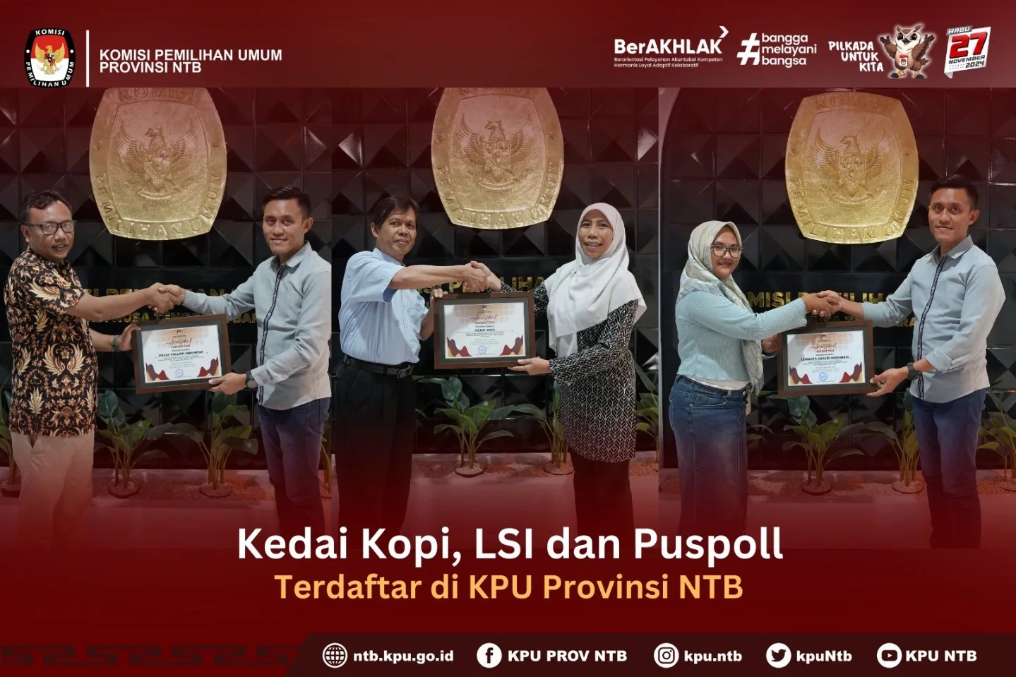 Tiga Lembaga Survei yakni Kedai Kopi, Lembaga Survei Indonesia (LSI) dan Pusat Polling Indonesia (Puspoll) terdaftar di KPU Provinsi NTB. Penyerahan Sertifikat terdaftar diberikan oleh KPU Provinsi NTB kepada tiga lembaga tersebut, Kamis (7/11) di Kantor KPU Provinsi NTB
