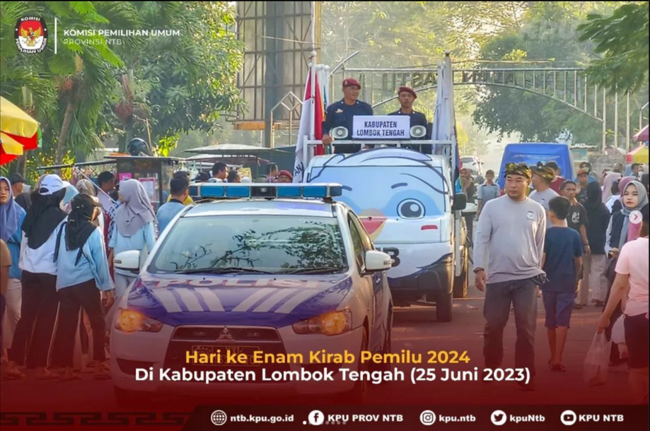 Pada hari keenam (25/6) Kirab Pemilu 2024 di Lombok Tengah oleh KPU Lombok Tengah, Tim Kirab Pemilu 2024 melanjutkan misinya dalam menyebarkan informasi Pemilu 2024 dengan menyambangi masyarakat yang berada di Lombok Tengah.