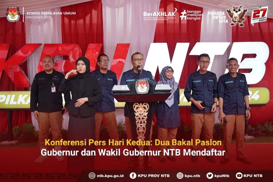 Tepat pukul 16.00 Wita KPU Provinsi NTB menutup masa pendaftaran hari kedua tanggal 28 Agustus 2024. Di hari kedua ini, Dua Bakal Pasangan Calon (Paslon) mendaftar ke KPU Provinsi NTB sebagai Paslon Gubernur dan Wakil Gubernur NTB Tahun 2024.