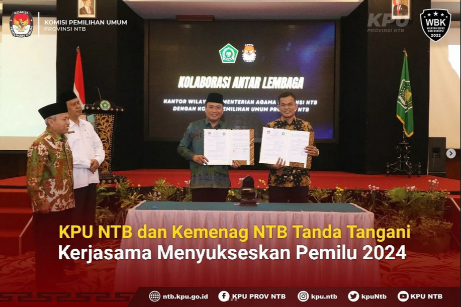 KPU Provinsi NTB bersama Kantor Wilayah Kementerian Agama Provinsi NTB menandatangani Nota Kesepahaman dalam rangka kerja sama antar lembaga menyukseskan Penyelenggara Pemilu 2024