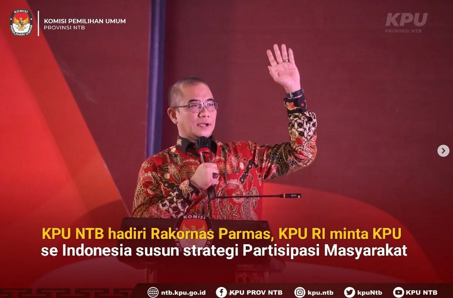 KPU Provinsi NTB hadir pada acara Rapat koordinasi Nasional partisipasi masyarakat di Manado, (15/9). Dalam arahannya Ketua KPU Republik Indonesia Hasyim Asy'ari meminta seluruh KPU Provinsi dan KPU Kabupaten kota se Indonesia untuk menyusun Strategi meningkatkan partisipasi masyarakat pada Pemilu 2024.