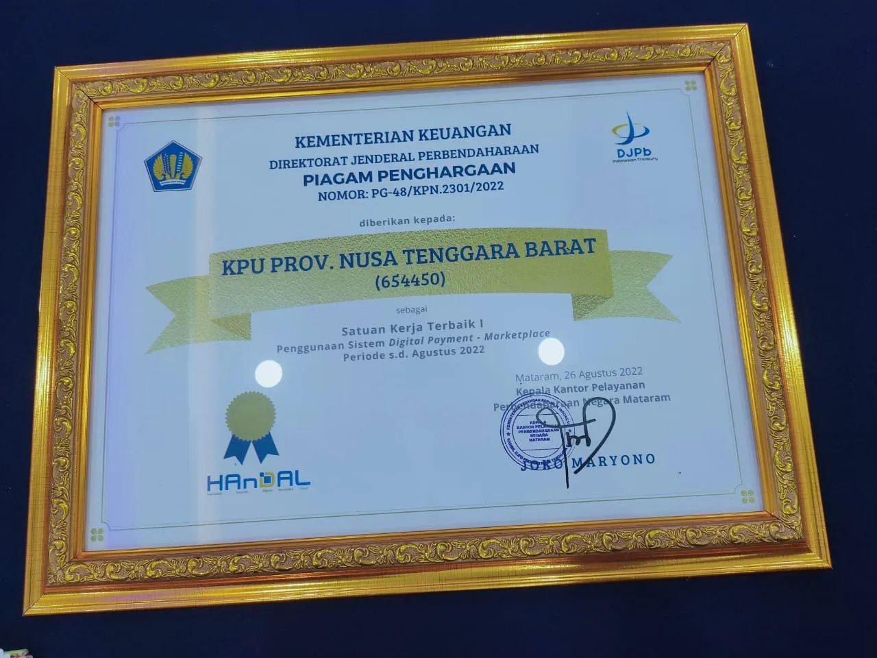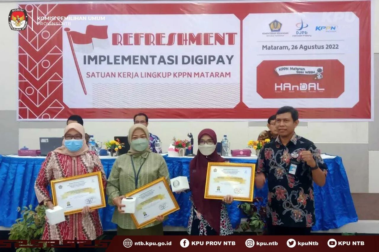 KPU Provinsi NTB meraih Penghargaan sebagai Satuan Kerja Terbaik I Penggunaan Sistem Digital Payment - Marketplace (Digipay) pada acara Refresment Implementasi Digipay KPPN Mataram Tahun 2022,