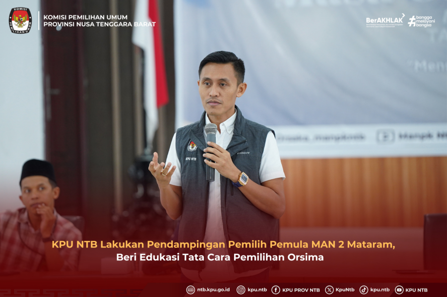 KPU Provinsi NTB melakukan pendampingan bagi pemilih pemula dalam pelaksanaan Pemilihan Presiden dan Wakil Presiden Organisasi Siswa Intra Madrasah (Orsima) di MAN 2 Mataram. Kegiatan pendidikan pemilih ini berlangsung pada Sabtu (1/8) di MAN 2 Mataram yang dihadiri langsung oleh Ketua Divisi Sosialisasi Pendidikan Pemilih KPU Provinsi NTB, Agus Hilman.