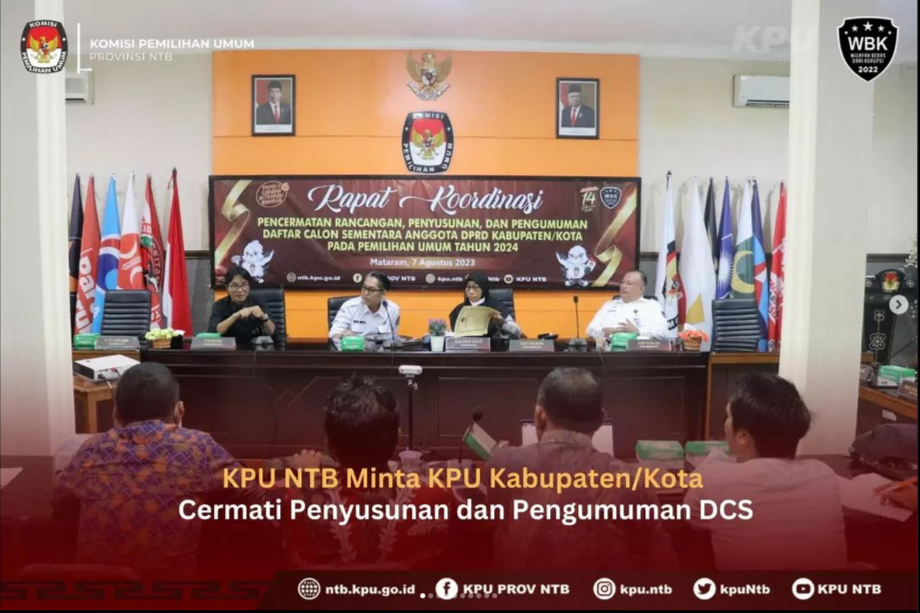 KPU Provinsi NTB telah melaksanakan Rapat Koordinasi terkait persiapan KPU Kabupaten/Kota se-NTB dalam menghadapi tahapan Pencermatan Rancangan, Penyusunan, dan Pengumuman Daftar Calon Sementara (DCS) Anggota DPRD Kabupaten/Kota pada hari Senin (7/8).