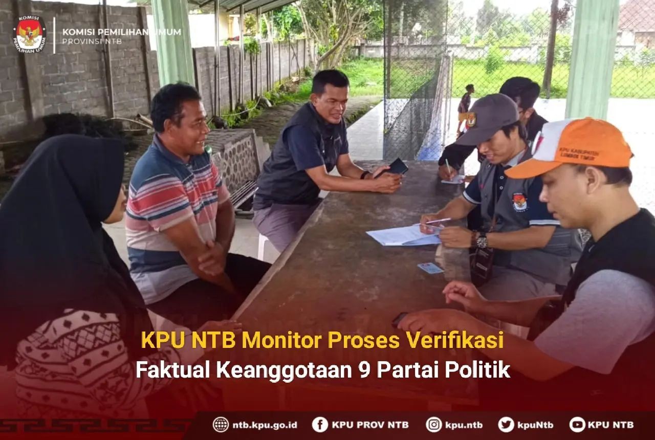 Setelah menyelesaikan Tahap verifikasi kepengurusan tingkat Provinsi, KPU Provinsi NTB melakukan monitoring pelaksanaan Verifikasi Faktual (Verfak) Keanggotaan untuk 9 Partai Politik yang dinyatakan memenuhi syarat verifikasi administrasi