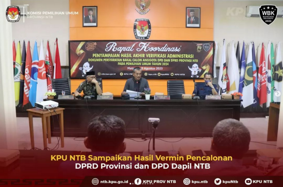 KPU Provinsi NTB menyampaikan hasil akhir verifikasi administrasi dokumen persyaratan bakal calon Anggota Dewan Perwakilan Rakyat Daerah (DPRD) Provinsi NTB dan bakal calon anggota Dewan Perwakilan Daerah (DPD) Dapil Provinsi NTB
