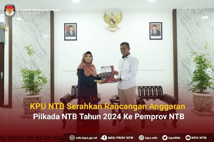 KPU Provinsi NTB menyerahkan Rencana Anggaran dan Biaya (RAB) Pemilihan Gubernur dan Wakil Gubernur Provinsi NTB Tahun 2024. RAB tersebut diterima oleh Wakil Gubernur Provinsi NTB Sitti Rohmi Djalilah di pendopo, Kamis (8/9)