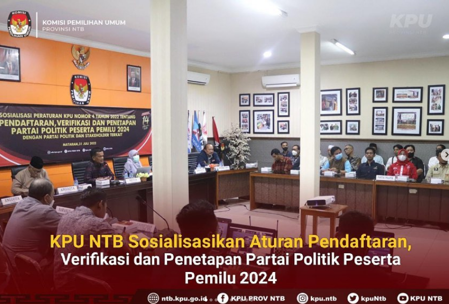 Dalam rangka menyamakan pemahaman dan persepsi terkait Pendaftaran, Verifikasi, dan Penetapan Partai Politik Peserta Pemilu, KPU Provinsi NTB telah melakukan Sosialiasi PKPU Nomor 4 Tahun 2022 kepada Partai Politik, Bawaslu, Biro Pemerintahan, dan Kesbangpoldagri di wilayah Provinsi NTB secara hybrid (luring dan daring), Minggu (31/07).