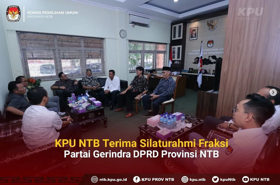KPU Provinsi NTB menerima audiensi sekaligus silaturahmi Fraksi Partai Gerindra DPRD Provinsi NTB. Anggota Fraksi yang hadir yaitu Sudirsah Sujanto, Nauvar Furqony Fafinduan, Lalu Wirajaya, Lalu Sudiartawan, H. Haerul Warisin, dan H. Abdul Talib
