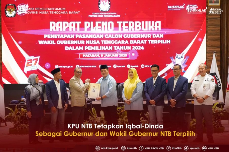 KPU Provinsi NTB menetapkan pasangan Calon Gubernur dan Calon Wakil Gubernur NTB Nomor Urut 3, H Lalu Muhammad Iqbal dan Hj Indah Dhamayanti Putri, (Iqbal-Dinda) sebagai Gubernur dan Wakil Gubernur NTB Terpilih pada penyelenggaraan Pilgub NTB 2024.
