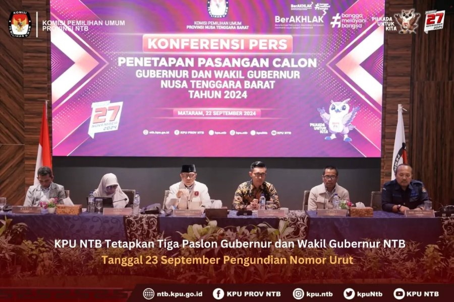 KPU Provinsi NTB menetapkan tiga pasangan calon (paslon) Gubernur dan Wakil Gubernur pada Pemilihan Gubernur (Pilgub) NTB 2024. Ketiga pasangan calon tersebur adalah Zulkieflimansyah-Suhaili FT (Zul-Uhel), Sitti Rohmi Djalillah-Musyafirin (Rohmi-Firin) dan Lalu Muhamad Iqbal-Indah Dhamayanti Putri (Iqbal-Dinda). Selanjutnya ke esokan harinya dilakukan Pengundian Nomor urut, di Kantor KPU Provinsi NTB