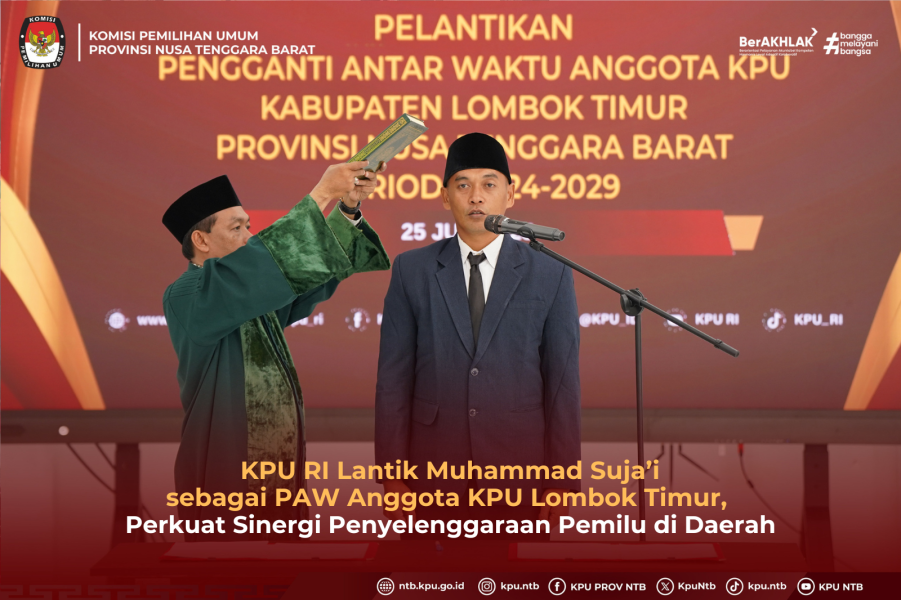 Komisi Pemilihan Umum (KPU) Republik Indonesia resmi melantik Muhammad Suja’i sebagai Pengganti Antar Waktu (PAW) Anggota KPU Kabupaten Lombok Timur, Jumat (25/7) secara daring di Kantor KPU Provinsi NTB. Ketua KPU Muhammad Afifuddin berharap kehadiran Muhammad Suja’i sebagai anggota baru dapat memperkuat kerja-kerja penyelenggara pemilu di tingkat daerah.
