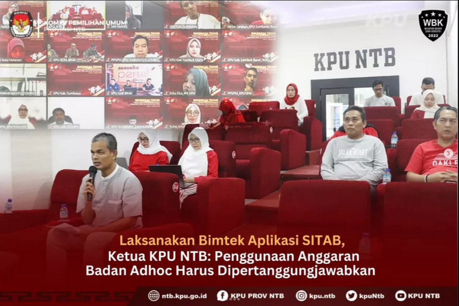 KPU Provinsi bersama KPU Kabupaten/Kota se-NTB Jumat, (11/8) melaksanakan Bimtek Pengelolaan dan Pertanggungjawaban Badan Adhoc Pemilu 2024 serta Aplikasi SITAB. Dalam arahannya Ketua KPU Provinsi NTB Suhardi Soud meminta setiap transaksi atas penggunaan anggaran badan adhoc harus langsung dipertanggungjawabkan agar tidak lalai dan abai.