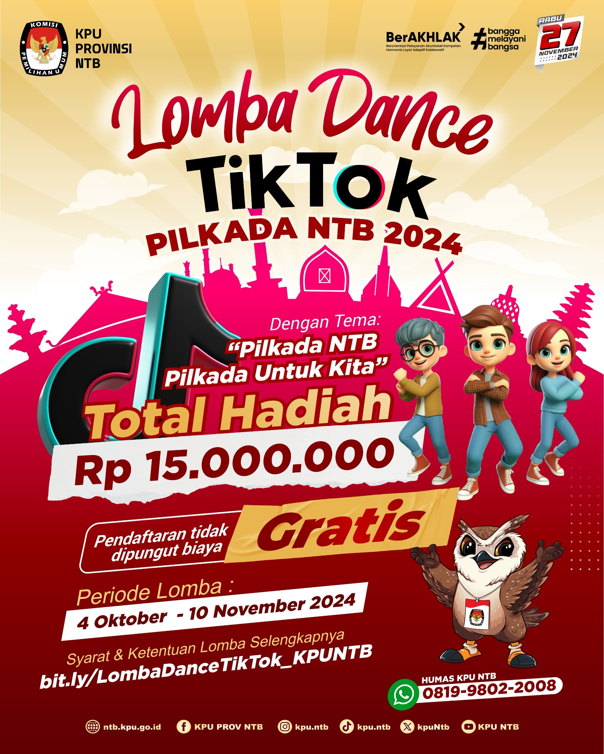 Lomba Dance Tik Tok Pilkada NTB 2024 Jumat, 04 Oktober 2024 18:00 1470 [Syarat & Ketentuan Lomba Selengkapnya] Bagikan: Dilihat 1,470 Kali.