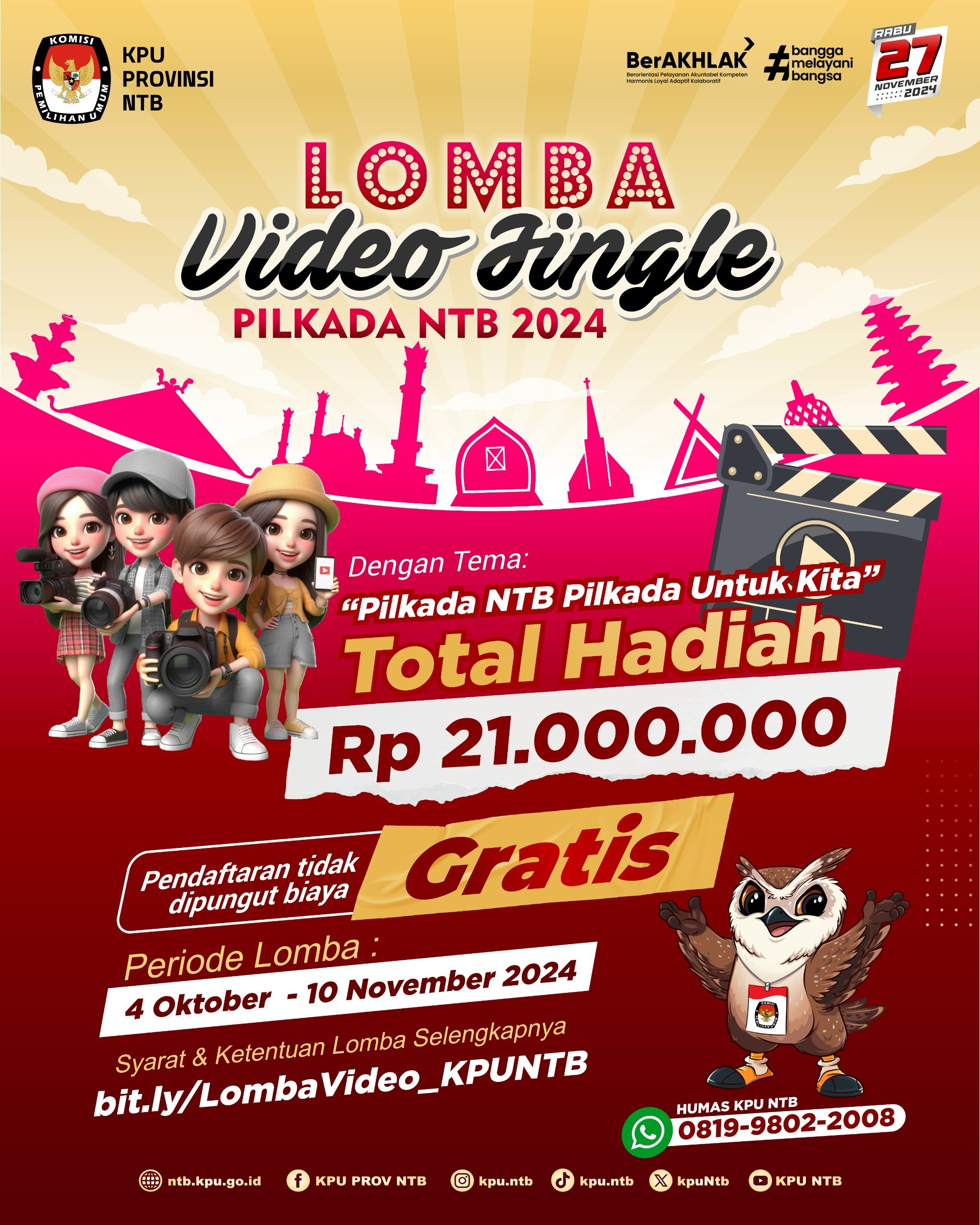 Lomba Video Jingle Pilkada NTB 2024 Jumat, 04 Oktober 2024 18:00 1117 [Syarat & Ketentuan Lomba Selengkapnya ] Bagikan: Dilihat 1,117 Kali.