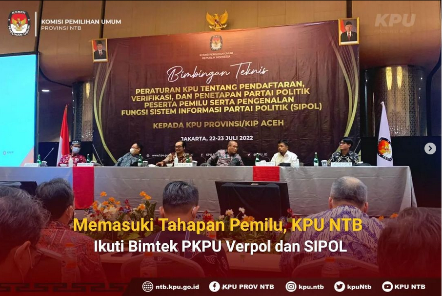 KPU Provinsi NTB bersama KPU Provinsi se-Indonesia hadiri Bimbingan Teknis Peraturan KPU tentang Pendaftaran, Verifikasi, dan Penetapan Partai Politik Peserta Pemilu (Verpol) serta pengenalan Fungsi Sistem Informasi Partai Politik (SIPOL) yang diselenggarakan oleh KPU RI di Jakarta, Jum'at (22/07).