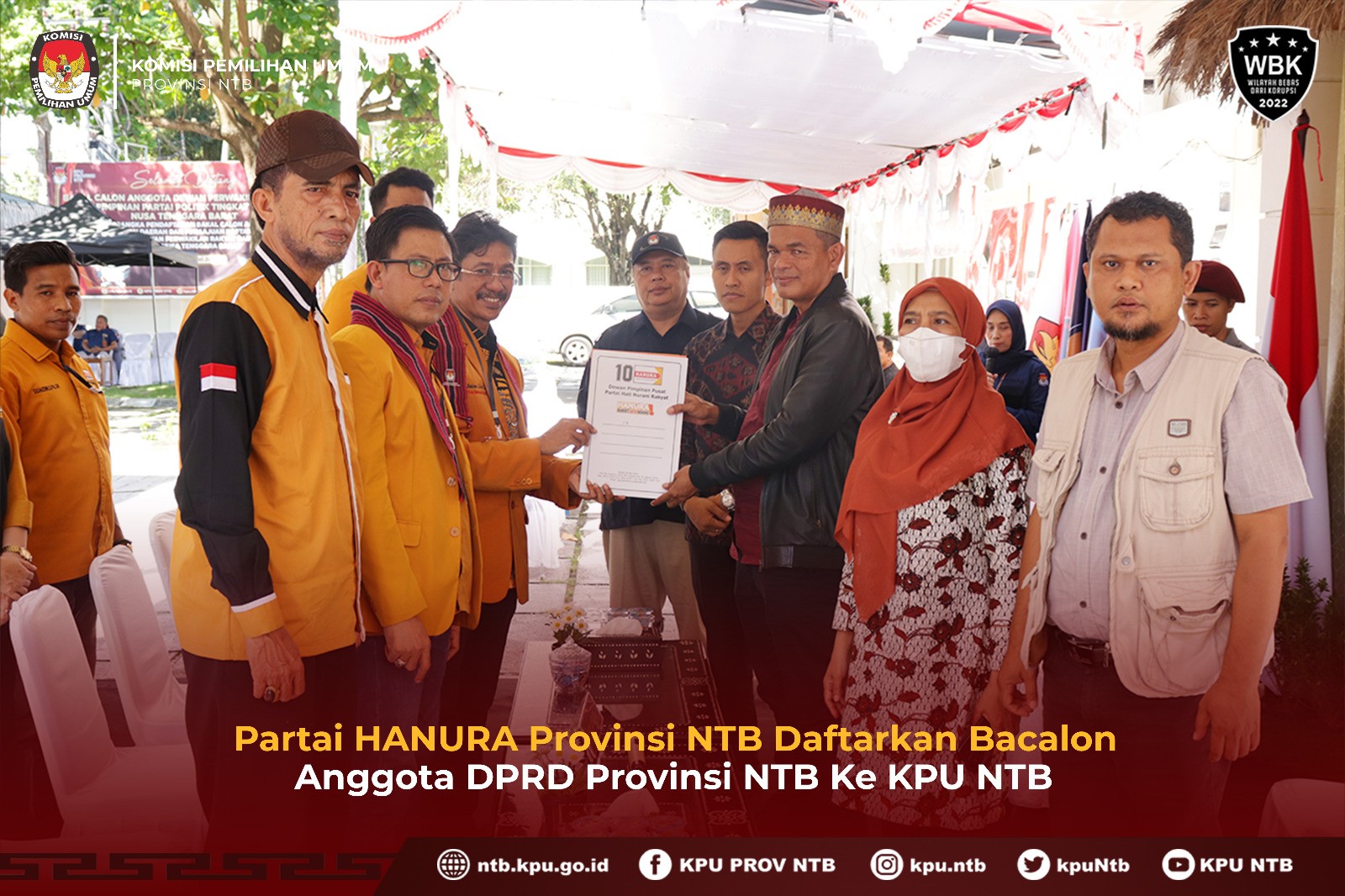 Dalam proses pendaftaran Partai HANURA Provinsi NTB disambut oleh Ketua, Anggota dan Sekretaris KPU Provinsi NTB. Partai Hati Nurani Rakyat Provinsi NTB menyampaikan Surat Pengajuan Bakal Calon Anggota DPRD Provinsi (Model B-Pengajuan-Parpol) dan Daftar Bakal Calon Anggota DPRD Provinsi NTB (Model B-Daftar Bakal Calon-Parpol) melalui Aplikasi Silon DPRD.