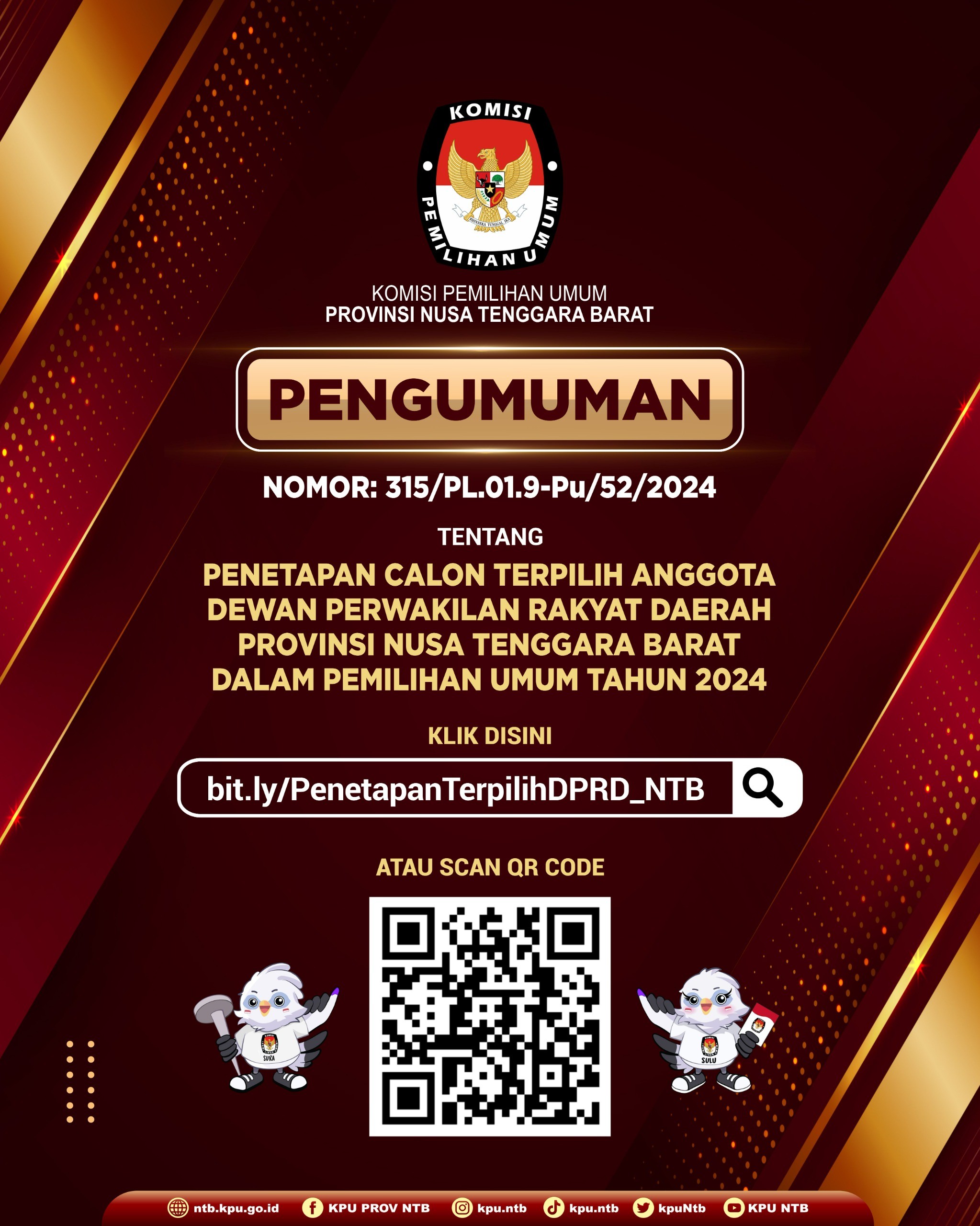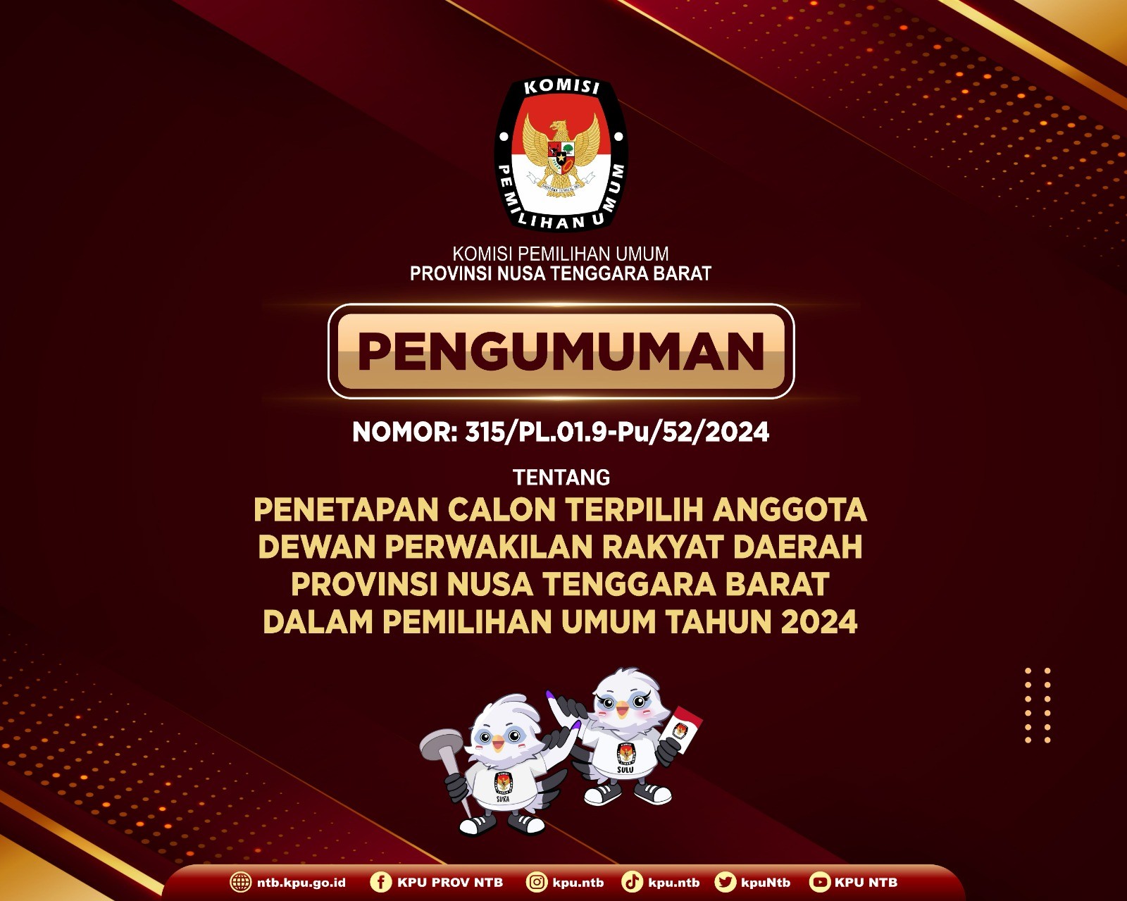 Pengumuman Calon Terpilih Anggota DPRD Provinsi NTB Pemilu Tahun 2024 Selasa, 18 Juni 2024 19:00 808 [Download Pengumuman] Bagikan: Dilihat 808 Kali.