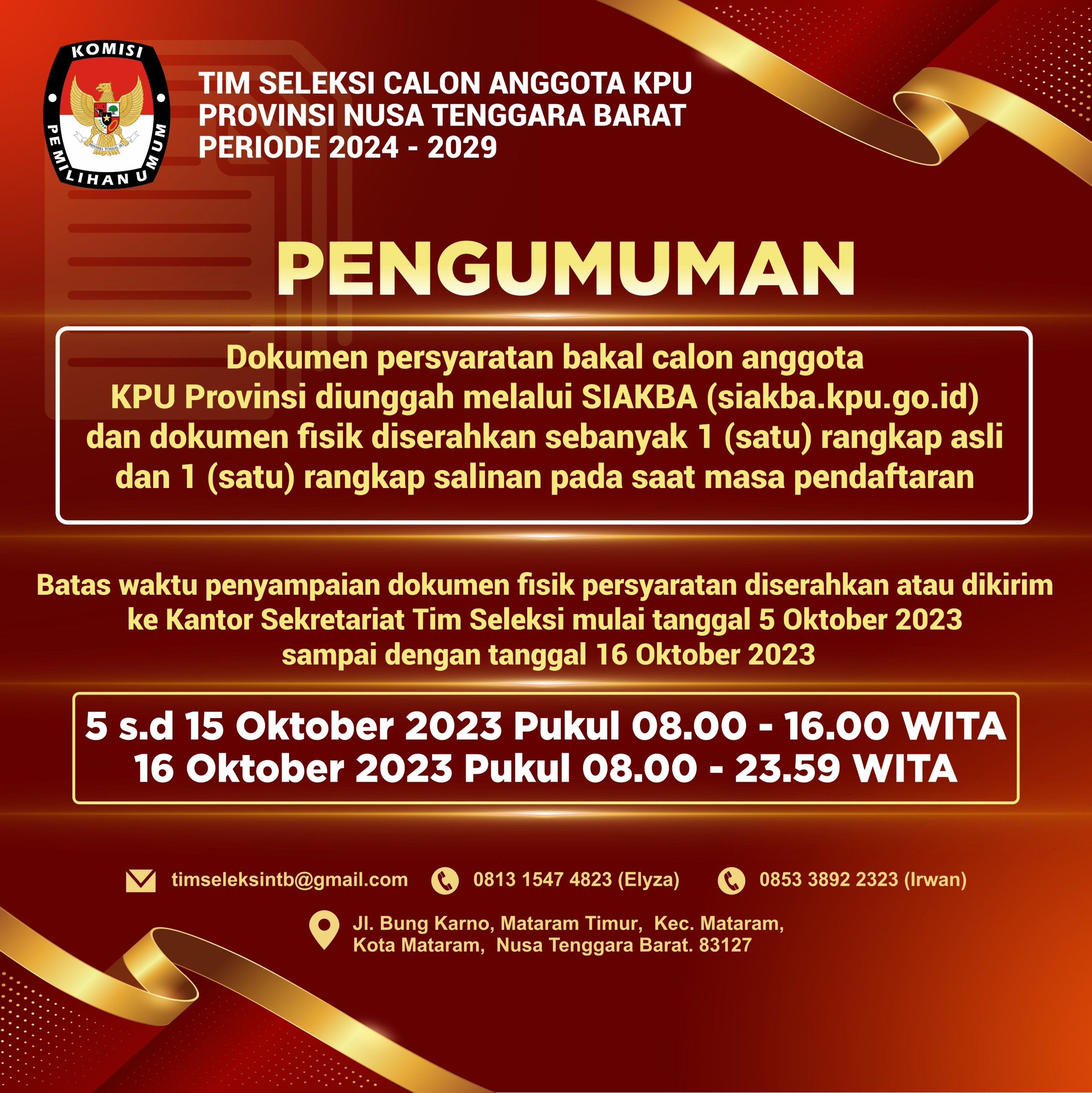 Pengumuman ketentuan penyerahan dokumen persyaratan bakal calon anggota KPU Provinsi Nusa Tenggara Barat Periode 2024 - 2029