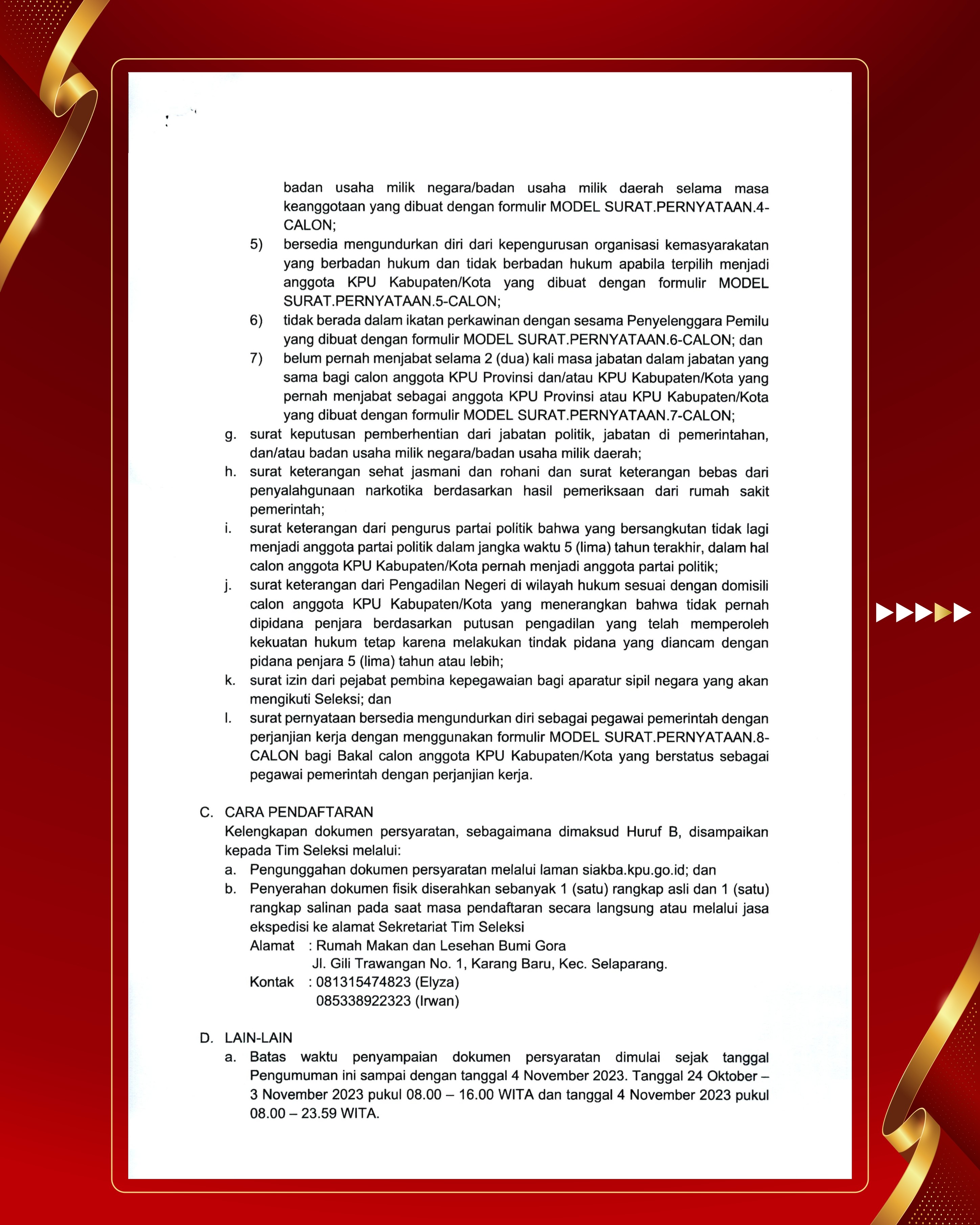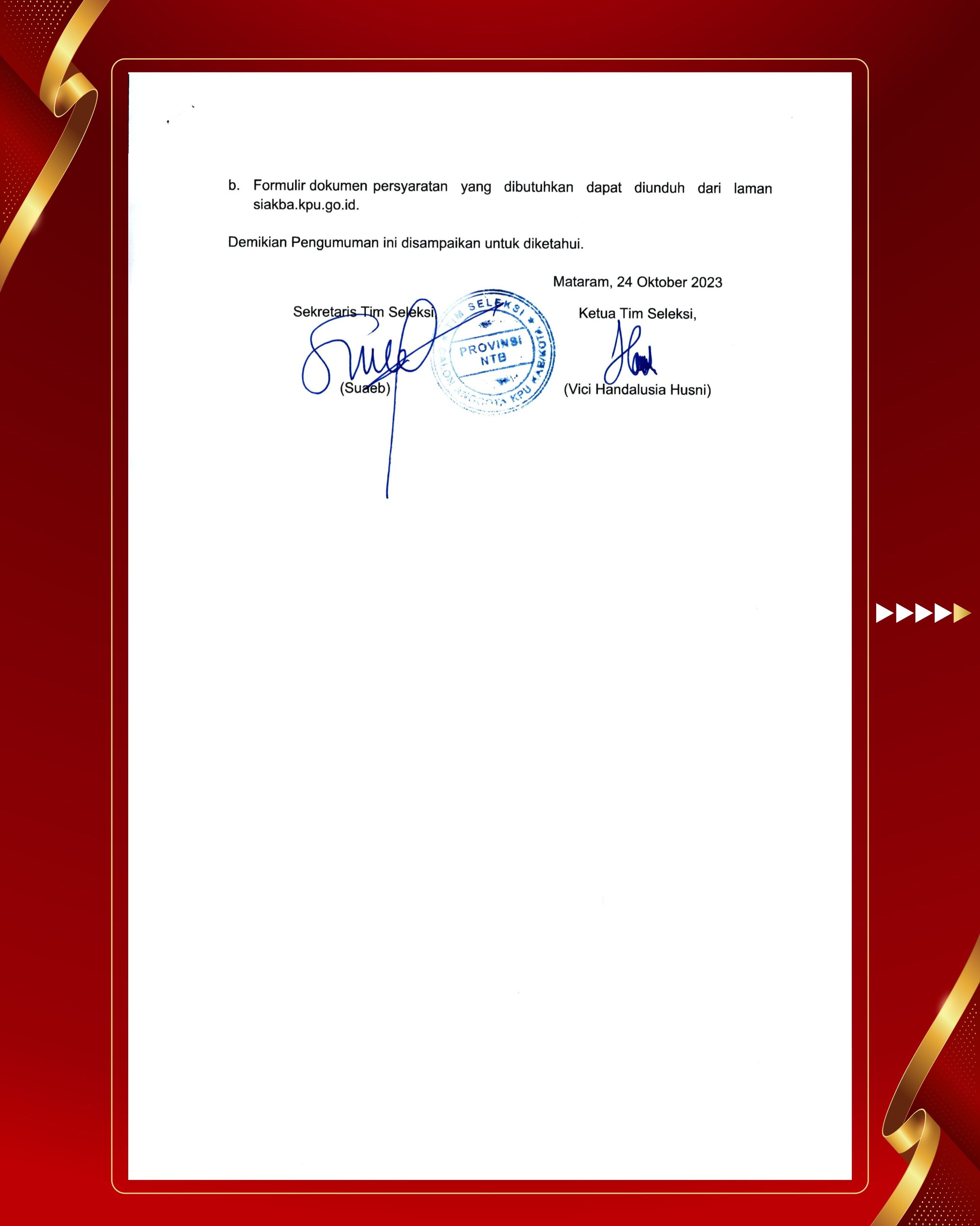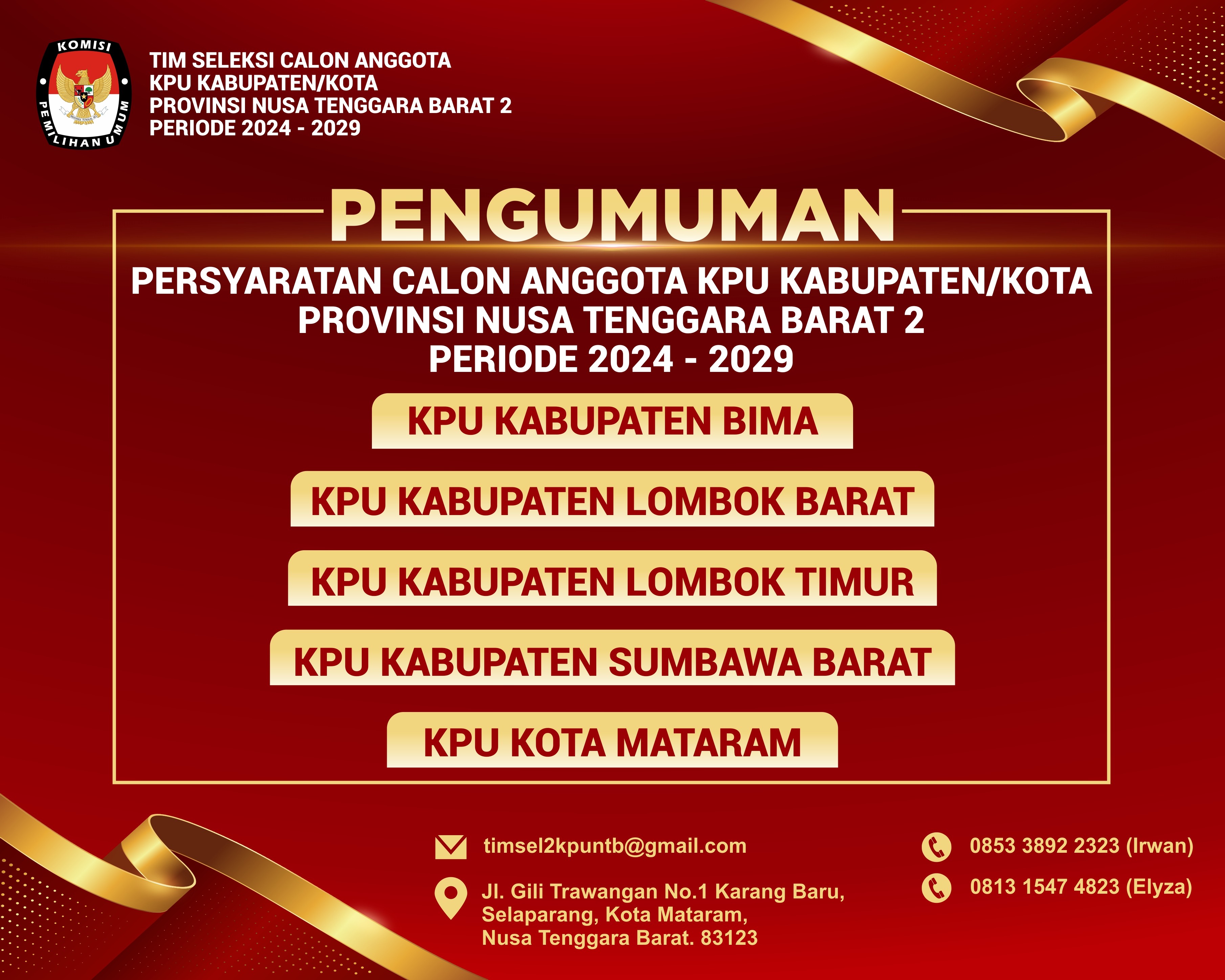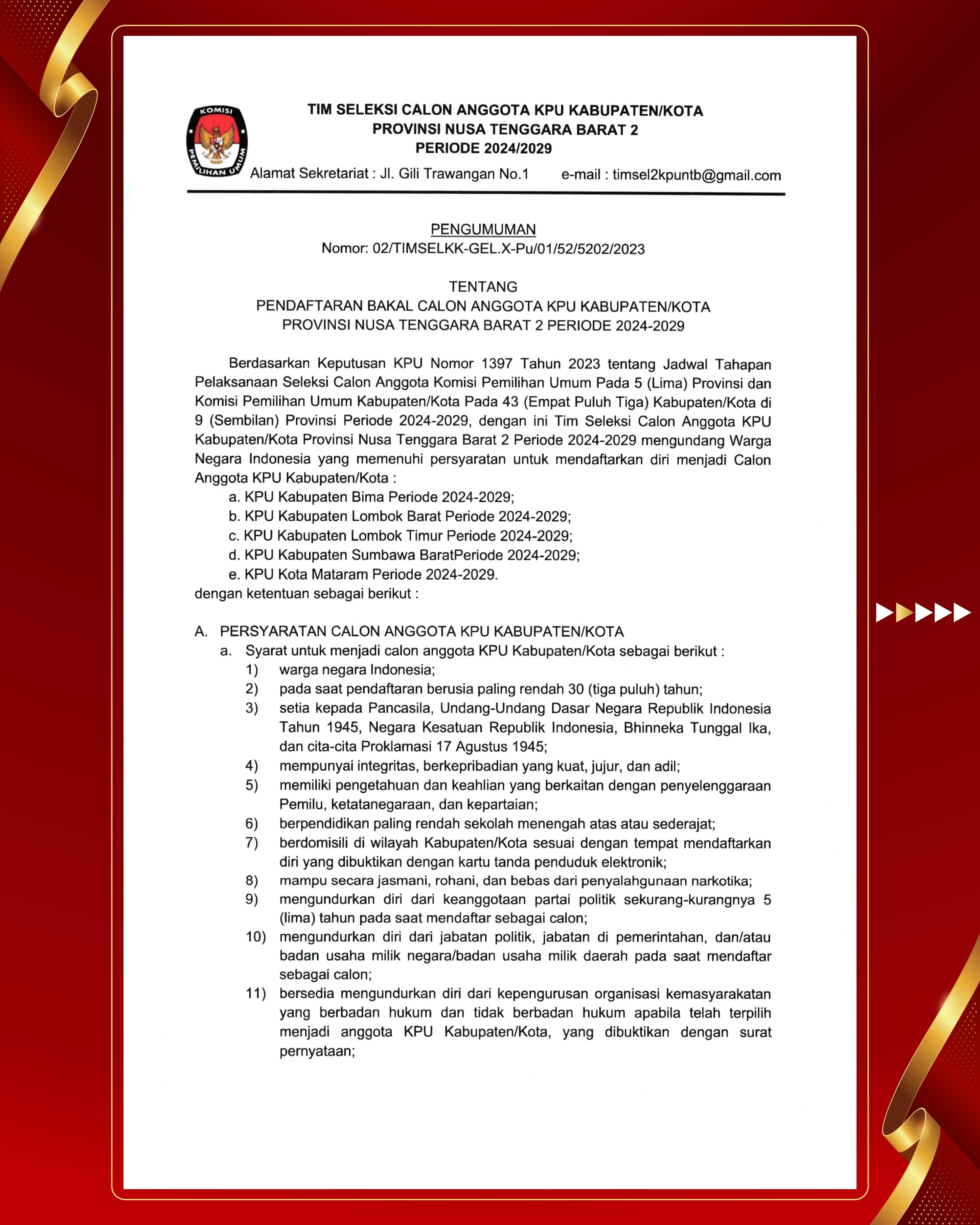Pengumuman Nomor : 02/TIMSELKK-GEL.X-Pu/01/5202/2023 Tentang Pendaftaran Bakal Calon Anggota KPU Kabupaten/Kota Provinsi Nusa Tenggara Barat 2 Periode 2024-2029