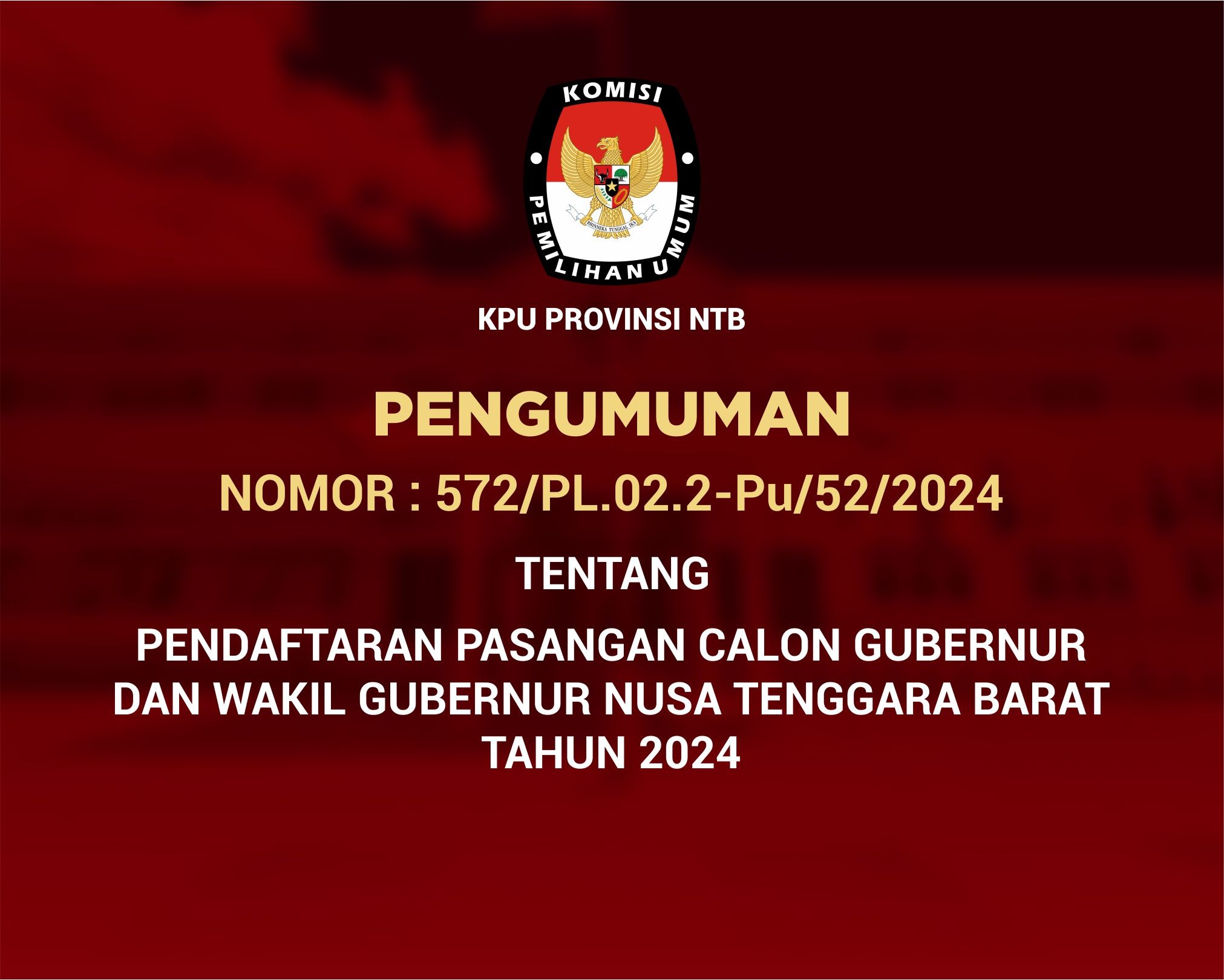 Pengumuman Pendaftaran Pasangan Calon Gubernur Dan Wakil Gubernur Nusa Tenggara Barat Tahun 2024 Sabtu, 24 Agustus 2024 14:00 862 [Download Pengumuman] Bagikan: Dilihat 862 Kali.